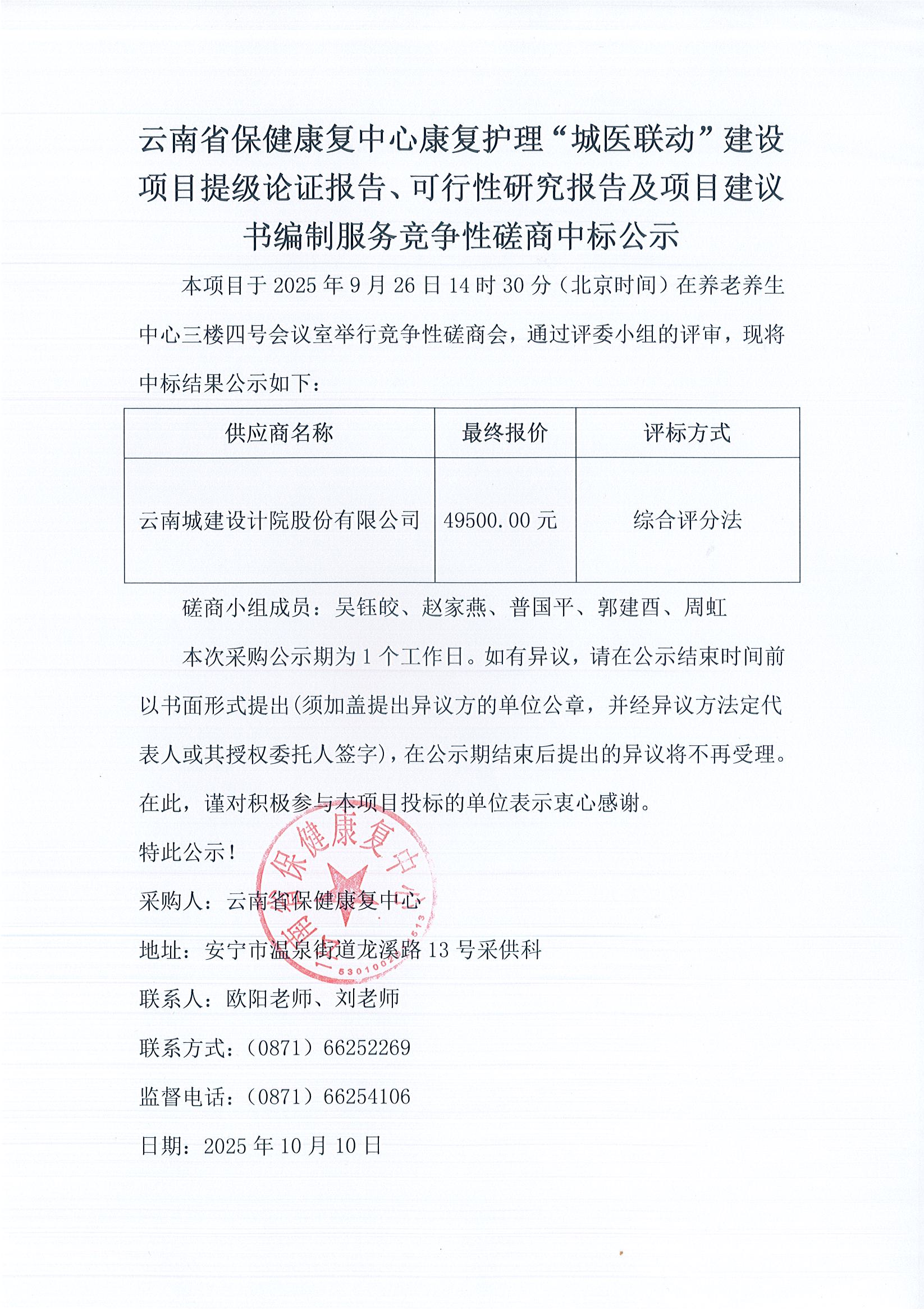 云南省保健康复中心康复护理“城医联动”建设项目提级论证报告、可行性研究报告及项目建议书编制服务竞争性磋商中标公示